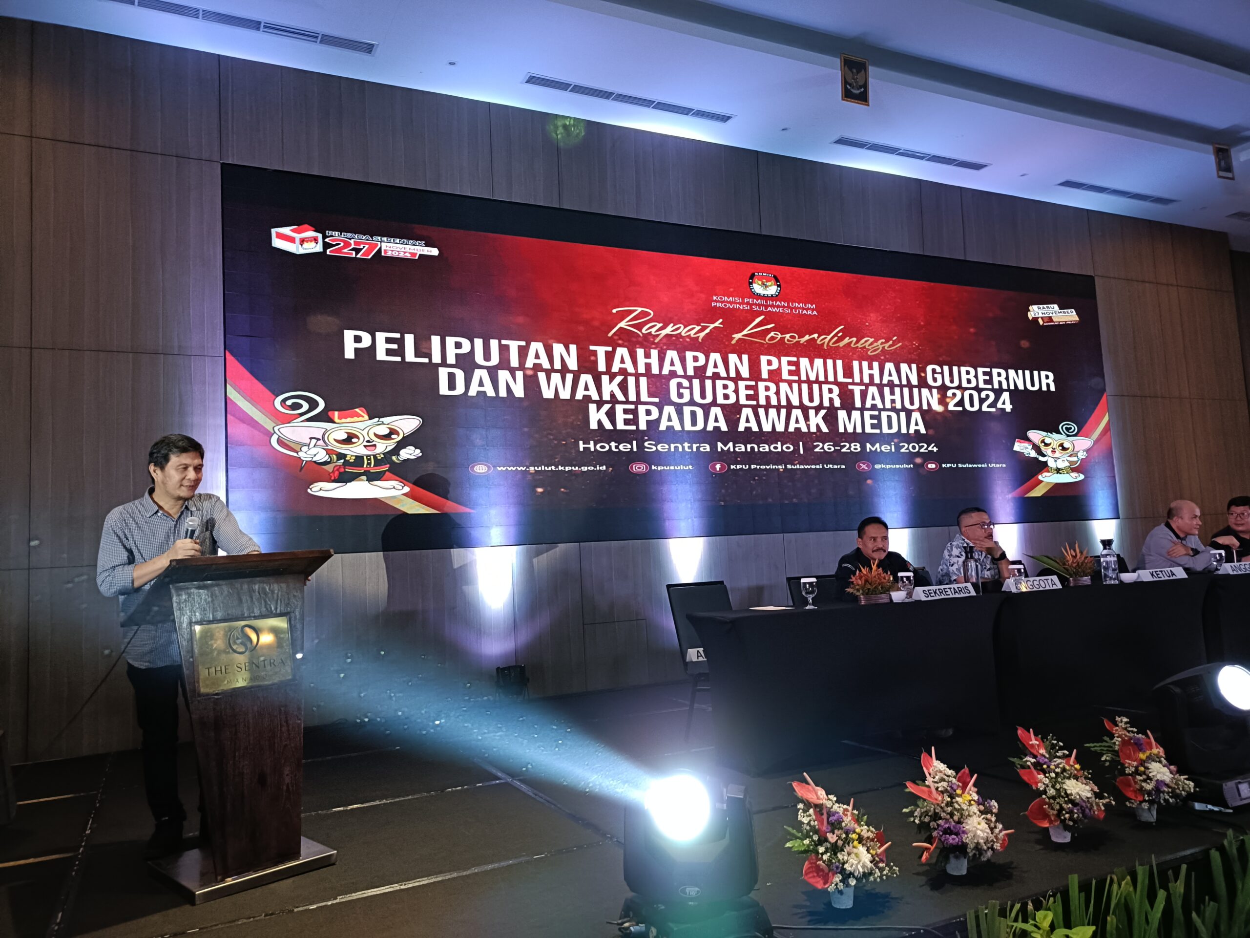 Komisi Pemilihan Umum Provinsi Sulawesi Utara Menggelar Rapat Koordinasi Peliputan Tahapan Pemilihan Gubernur dan Wakil Gubernur Tahun 2024 Kepada Awak Media bertempat di Hotel Sentra Manado, Kegiatan tersebut dilaksanakan dari tgl 26 – 28 Mei 2024.