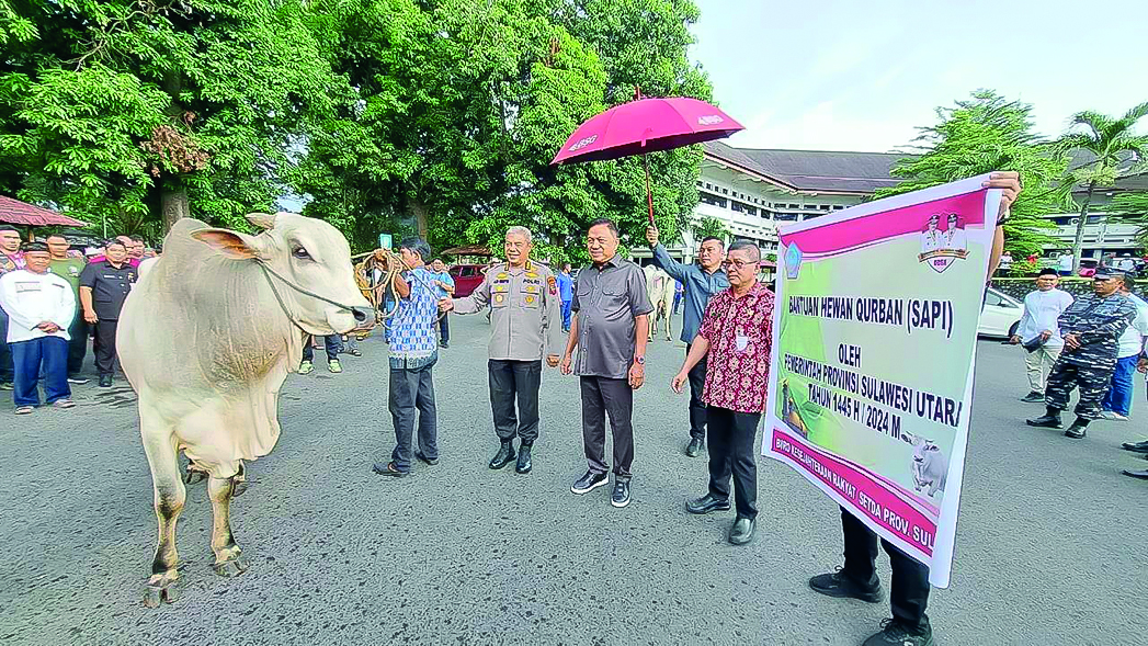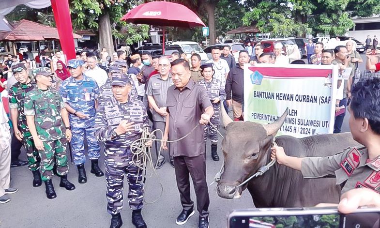MANADO, hckutim.com – Gubernur Sulut Prof Dr (HC) Olly Dondokambey menyerahkan secara simbolis hewan kurban sapi untuk hari raya Idul Adha kepada perwakilan sejumlah Mesjid, Jumat (14/6/2024) di halaman belakang kantor Gubernur Sulut, Manado.