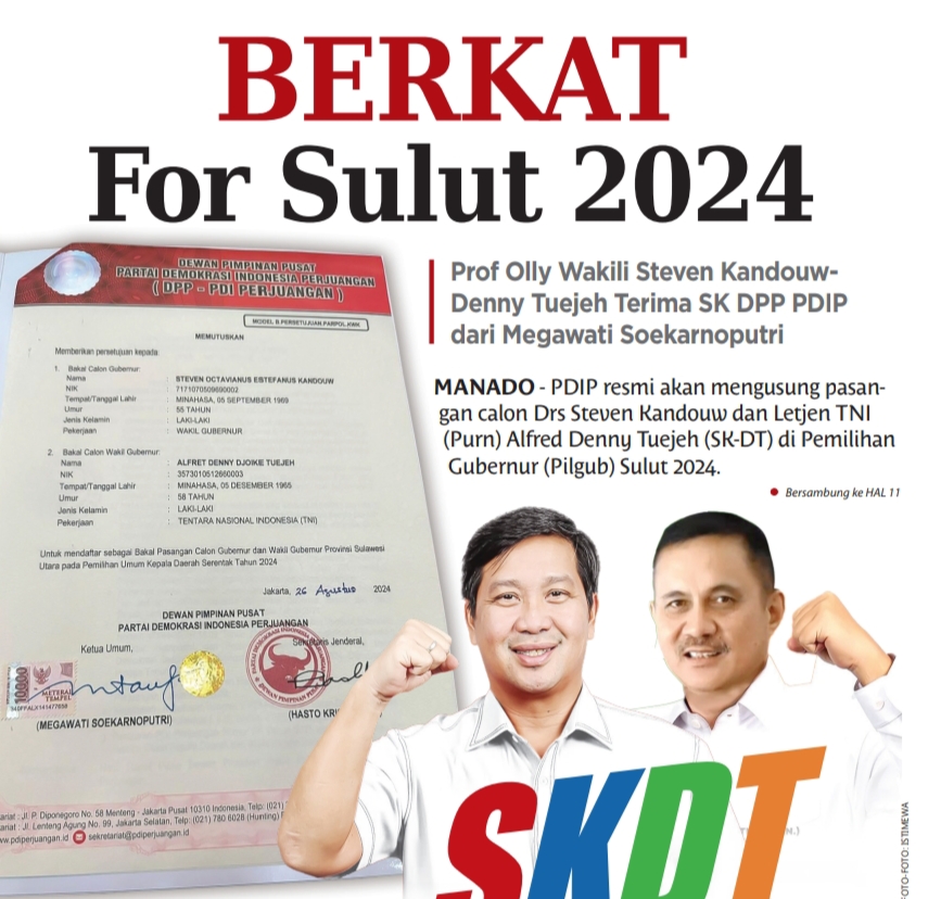MANADO, hckutim.com – PDIP resmi akan mengusung pasangan calon Drs Steven Kandouw dan Letjen TNI (Purn) Alfred Denny Tuejeh (SK-DT) di Pemilihan Gubernur (Pilgub) Sulut 2024.