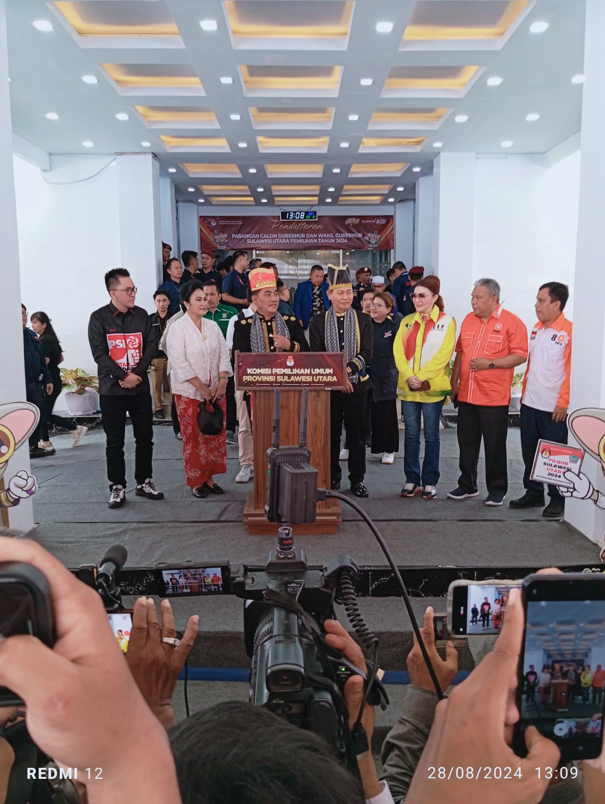 dengan diiringi ribuan pendukung yang membanjiri lokasi pendaftaran.YSK-VM yang diusung oleh delapan partai besar Gerindra, Nasdem, Golkar, PKB, PAN, Perindo, PKS, PSI, serta Partai Garuda tiba di kantor KPU Sulut sekitar pukul 09.51 WITA.